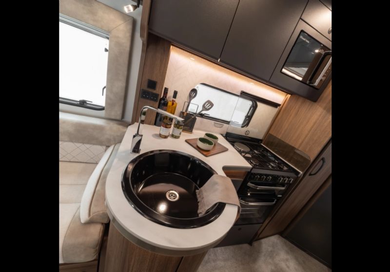 • Luxurious ‘Narbonne Oak with Charcoal and mesh’ craftsman built cabinetry with 24mm class-leading ‘Quiet-Close’ locker construction and storage, and positive locking, with contrast kitchen units’